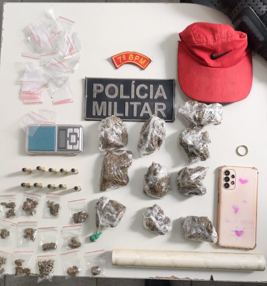 No entanto, os policiais rapidamente realizaram a abordagem e localizaram a bolsa. No seu interior, foram encontrados 13 sacos zip com substância análoga à maconha, 10 invólucros plásticos com a mesma droga, uma balança de precisão, material para o acondicionamento da substância ilícita e 10 munições de calibre .38 intactas.