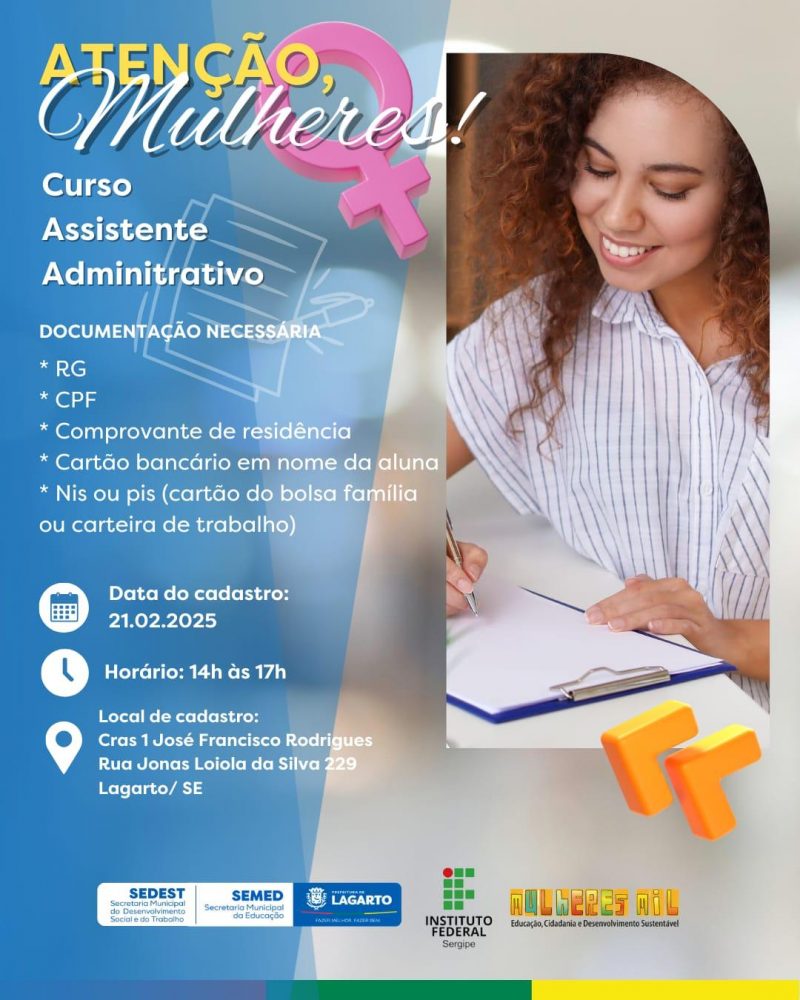 Em parceria firmada com a Prefeitura de Lagarto, por meio das secretarias municipais de Educação (Semed) e Desenvolvimento Social (Sedest), o Instituto Federal de Sergipe (IFS) abriu novas vagas nos cursos profissionalizantes de Assistente Administrativo e Agente de Alimentação Escolar para as mulheres lagartenses em situação de vulnerabilidade social.