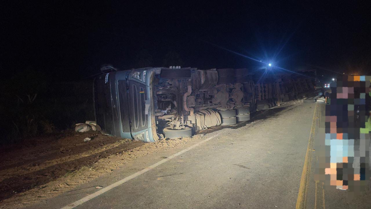 O acidente foi registrado como tombamento de veículo de carga. Não houve informações sobre a gravidade exata das lesões do condutor.