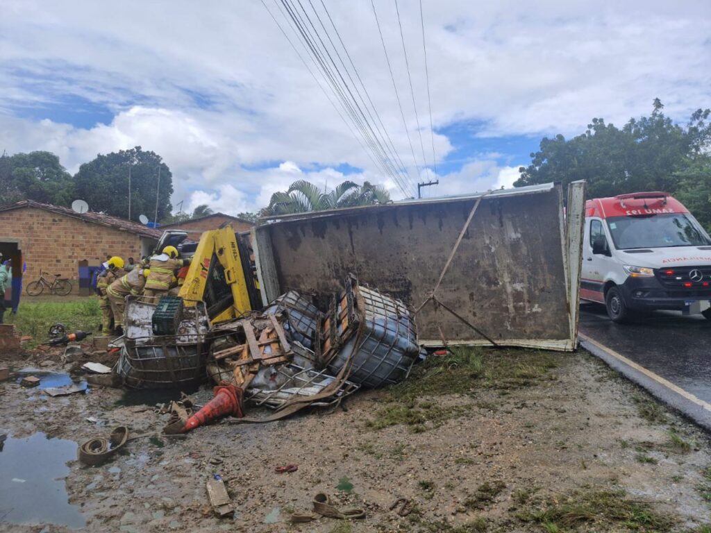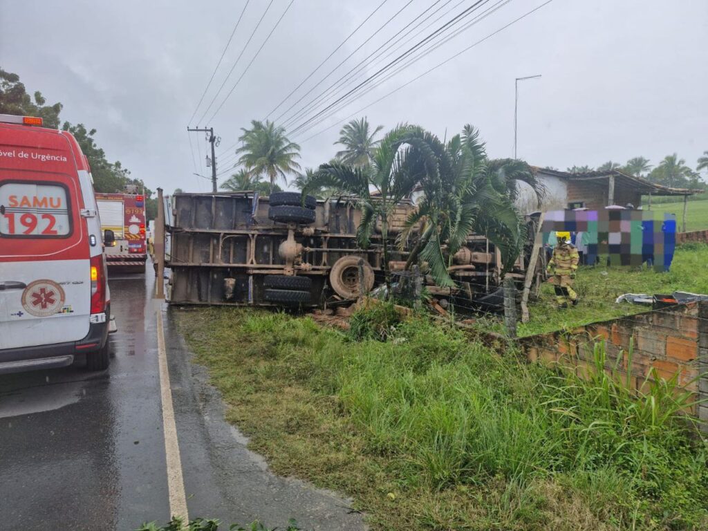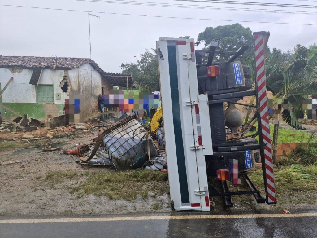 Segundo relatos colhidos no local, o acidente ocorreu por volta das 12h25, nas proximidades do campo de futebol do povoado. Após o estouro do pneu, o condutor perdeu o controle da direção, saiu da pista e o caminhão tombou, colidindo contra uma residência. Apesar do impacto, a proprietária da casa não sofreu ferimentos.
